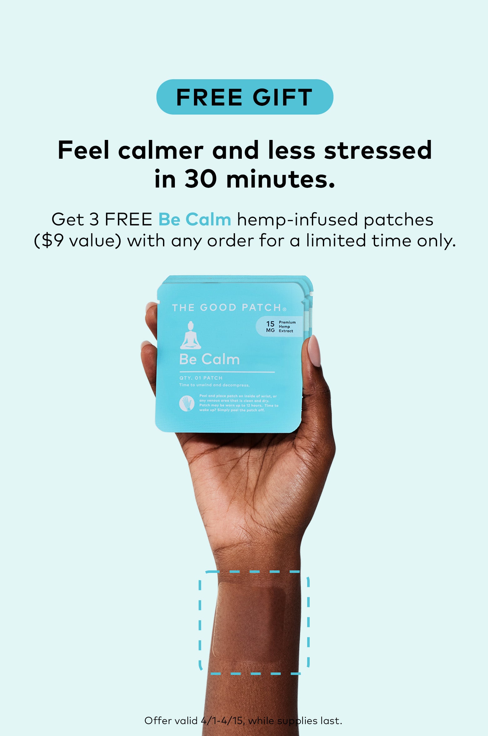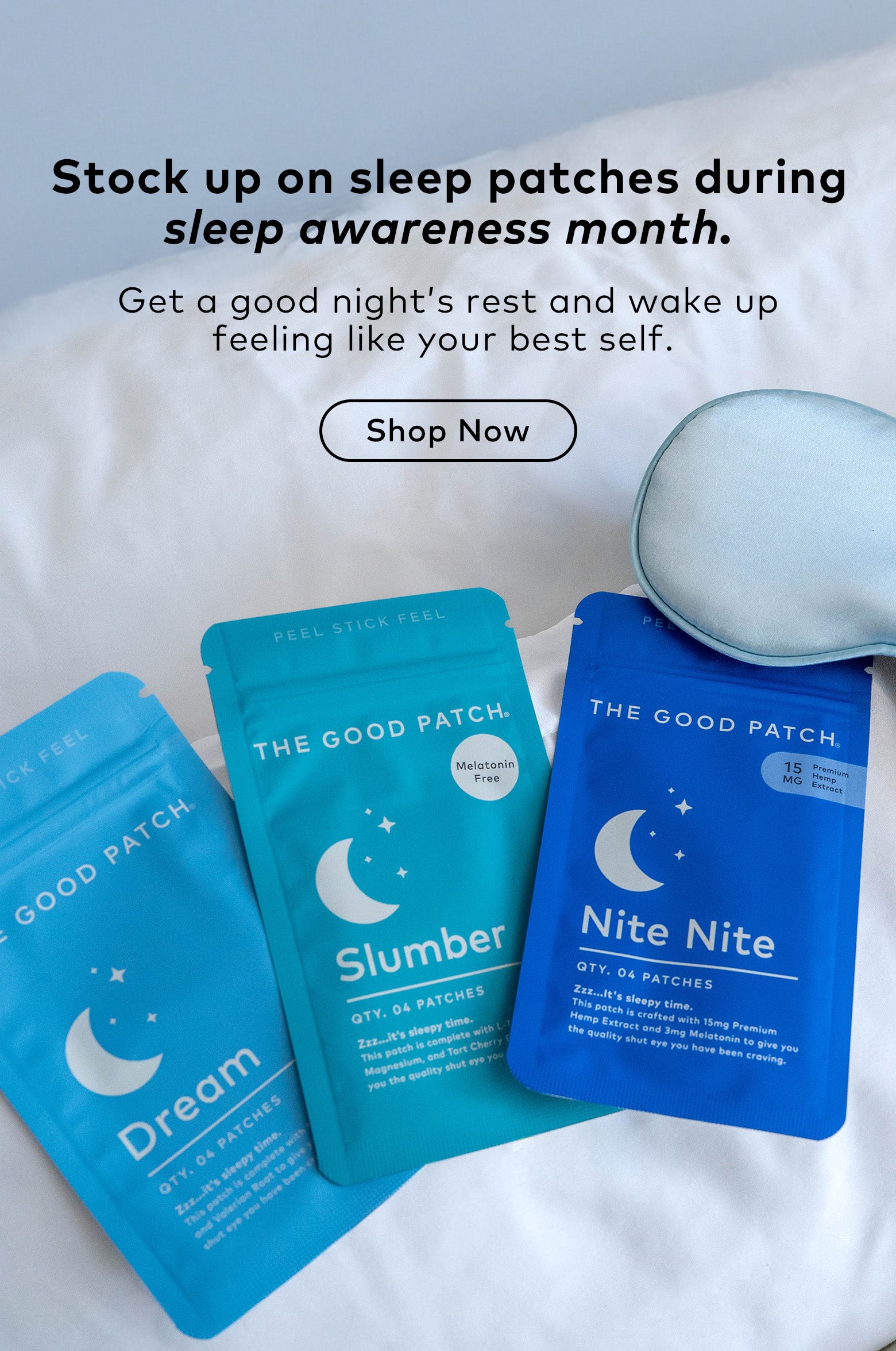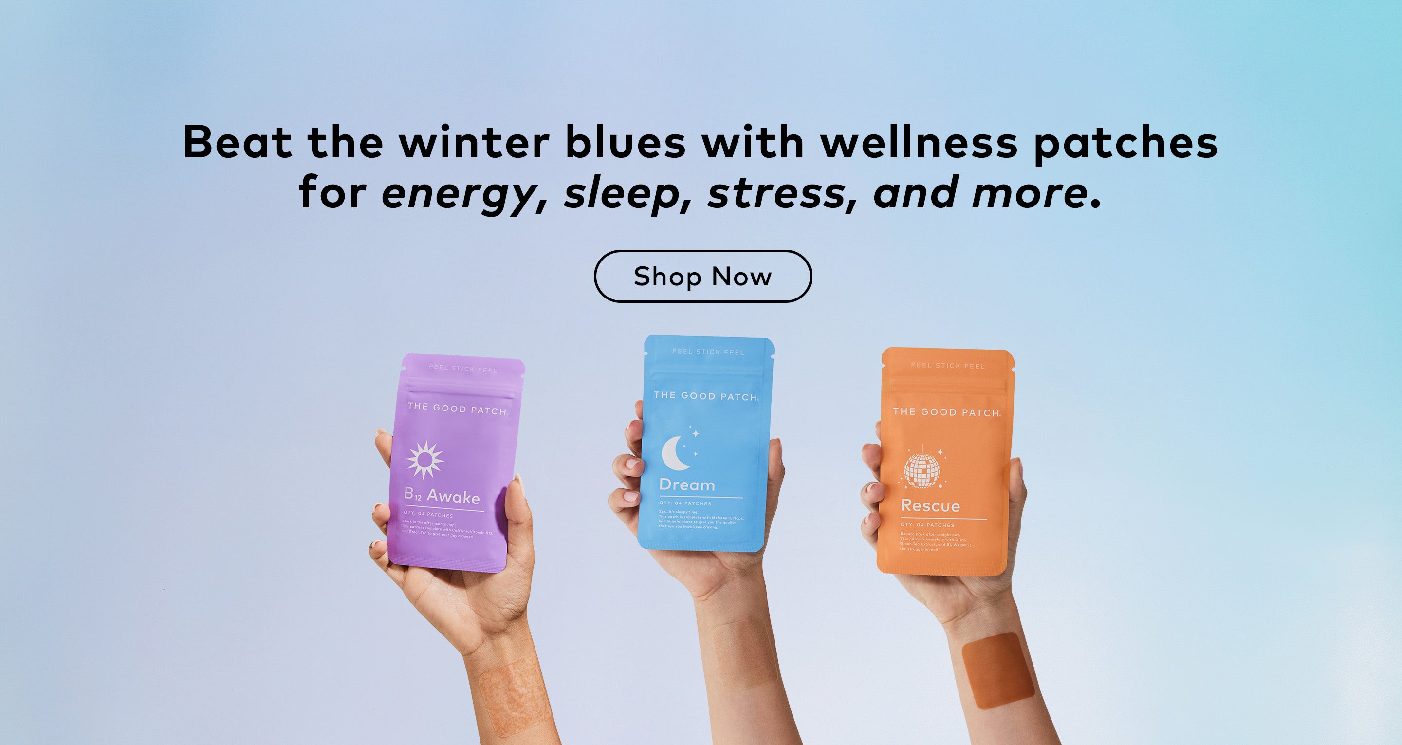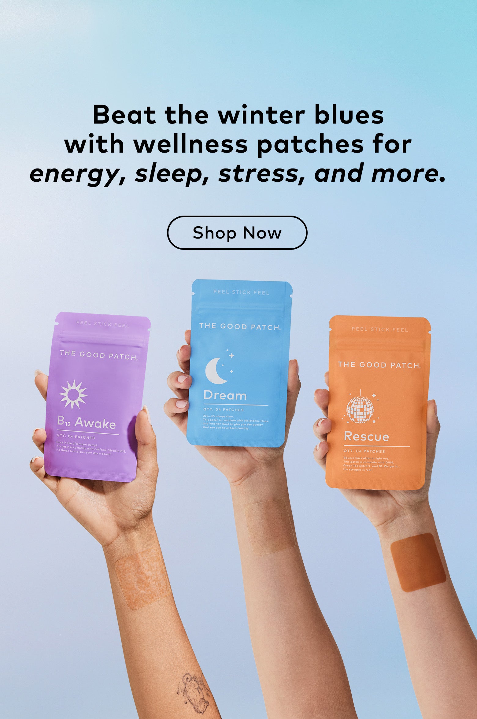 The Good Patch is a brand of plant-powered wearable wellness patches designed to help with life’s daily struggles. We offer better-for-you alternatives that help you feel good - one patch at a time. Whether you need some pep in your step, quality zzz’s, or relief from minor aches and pains, we’ve got you covered. With over 15 patches to choose from, we’ve got a patch for whatever life throws your way.