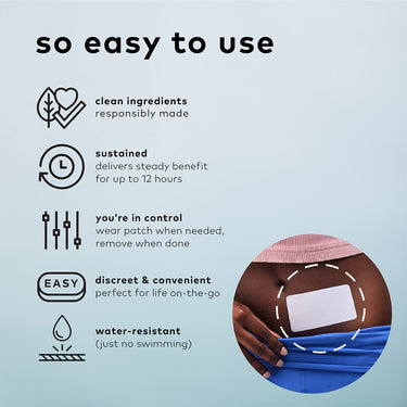 Our patches are an easy discreet way to manage life's everyday struggles, steadily releasing ingredients over an 8-12 hour period. Just peel, stick and remove when you're done. You're in complete control.